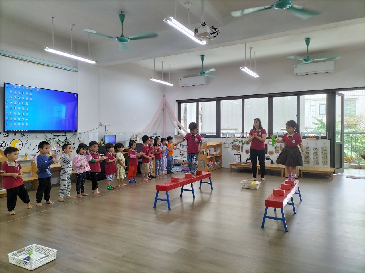 Phát triển vận động cho trẻ mầm non có ý nghĩa vô cùng quan trọng, bởi cơ thể trẻ đang phát triển mạnh mẽ, hệ thần kinh, cơ xương hình thành nhanh, bộ máy hô hấp đang hoàn thiện, cơ thể trẻ đang còn non yếu dễ bị phát triển lệch lạc, mất cân đối nếu không được chăm sóc giáo dục đúng đắn thì có thể gây nên những thiếu sót trong sự phát triển cơ thể trẻ mà không thể khắc phục được. Vì vậy chúng ta cần phải quan tâm đến việc phát triển vận động cho trẻ để nhằm đào tạo thế hệ trẻ Việt Nam trong tương lai phát triển cả về trí tuệ và thể chất.Trong trường mầm non các hoạt động, vận động được coi trọng, qua các giờ học các bé được phát triển các kỹ năng vận động. Hiểu được tầm quan trọng đó, hôm nay các bạn nhỏ lớp MGN B4 được cô giáo hướng dẫn thực hiện bài VĐCB" Đi trên ghế băng, bước qua chướng ngại vật". Thông qua bài học trẻ biết phối hợp tay chân nhịp nhàng một cách khéo léo, giữ được thăng bằng khi đi trên ghế thể dục, mắt nhìn thẳng. Khi gặp chướng ngại vật trên ghế trẻ biết nhấc cao chân lên và bước qua.