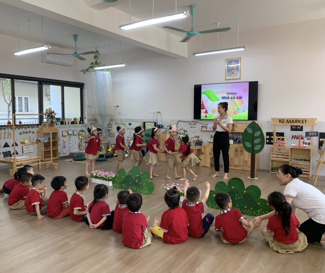 Có những việc ta không thể nào hoàn thành nếu chỉ có một mình, cần sự đoàn kết đồng lòng của tất cả mọi người. Điều đó khẳng định tầm quan trọng của sức mạnh tập thể.Chính vì vậy đối với mỗi bạn nhỏ, khi được nghe những câu chuyện thú vị là một điều rất hạnh phúc, vừa giúp bé phát huy trí tưởng tượng, vừa có thể nhờ vào những câu chuyện để dạy cho bé nghe nhiều bài học ý nghĩa trong cuộc sống, có tinh thần đoàn kết trong học tập cũng như vui chơi. Các bạn nhỏ lớp Mẫu giáo Nhỡ B2 rất hào hứng, say xưa nghe cô giáo Bùi Bích Phương kể câu chuyện “Nhổ củ cải”. Trong giờ học các bạn đã được hóa thân thành các nhân vật trong câu chuyện, đã được sử dụng đôi tay khéo léo để làm ra những chiếc rối tạo hình của các nhân vật trong truyện vô cùng ngộ nghĩnh.