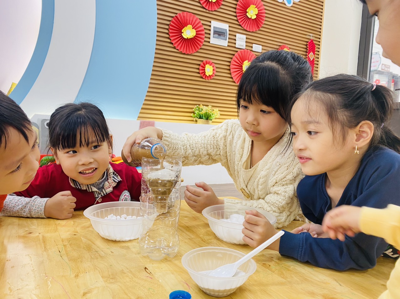 Các bé Lớp MGL A1 thực hành làm bình lọc nước mini 🔄, với các vật liệu như: Cát 🏖, sỏi 🪨và bông gòn ⚪.