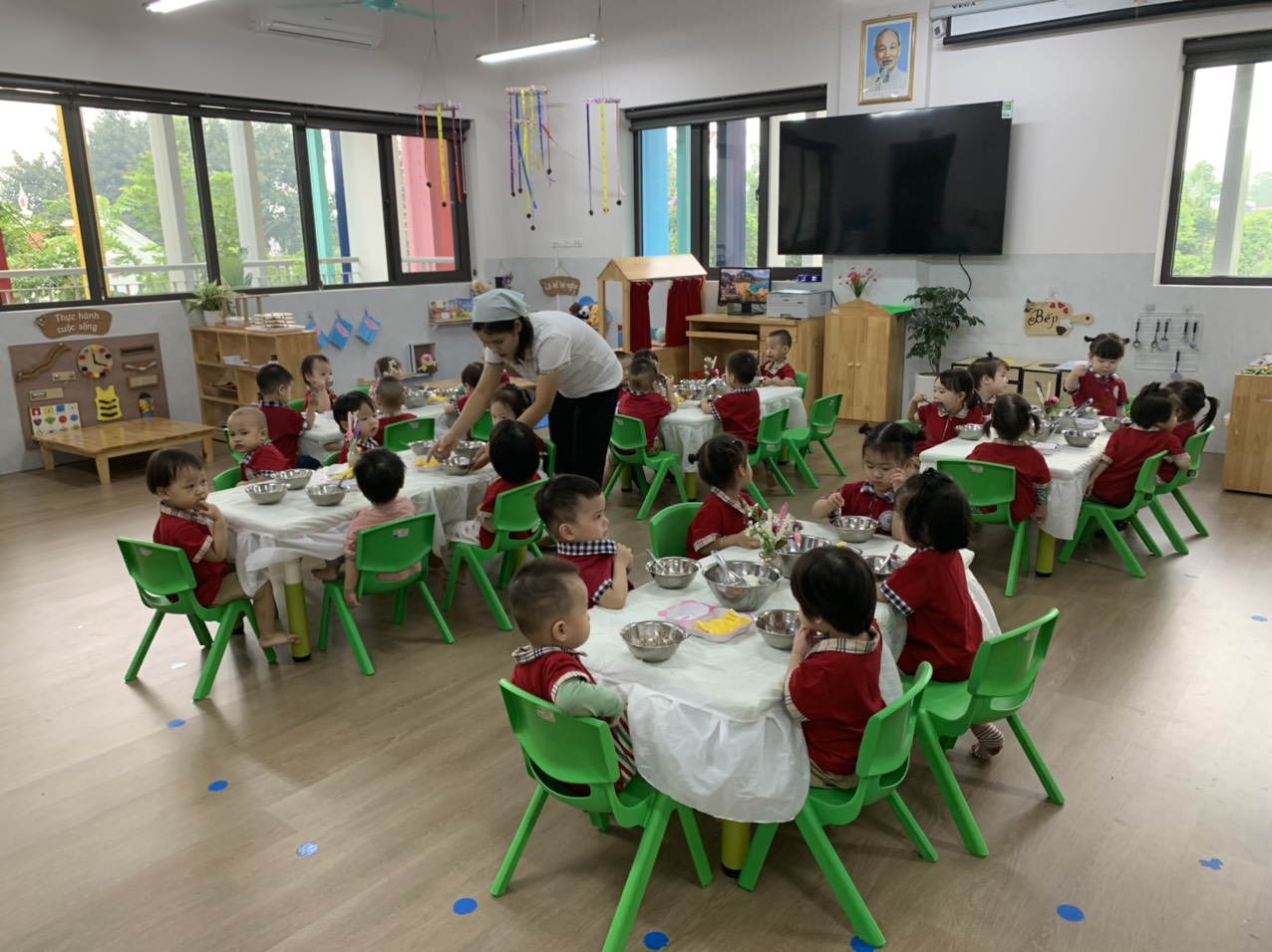 Sau một thời gian đến lớp, các bé lớp D1 đã có những kỹ năng tự phục vụ cần thiết cho một bữa ăn của mình rồi. Các bé đã biết cách cầm thìa xúc cơm vừa phải và ăn gọn gàng không làm rơi vãi cơm ra bàn. Sau khi ăn xong, các bé còn biết cất bát thìa, cất ghế đúng nơi quy định nữa đấy. Bé nào cũng ăn rất ngon và ăn hết suất của mình. Các bé thật là giỏi phải không nào.