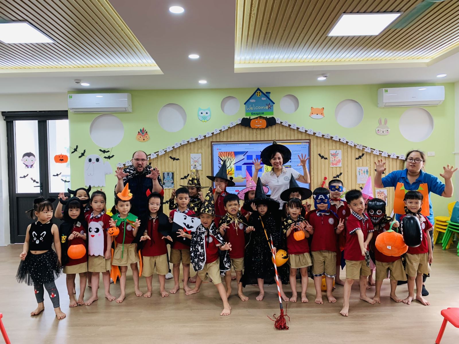 Mỗi giờ học của trẻ tại phòng học tiếng anh là những cảm xúc khác nhau với thầy cô giáo bên trung tâm. Chương trình tiếng anh vui nhộn với những bài học dễ hiểu. Hòa chung không khí Halloween, phòng học được trang trí đẹp mắt cùng những bộ trang phục và phụ kiện được các thầy cô giáo chuẩn bị. Các bạn nhỏ vô cùng háo hức khi bước chân vào phòng, sẽ đem lại hiệu quả cao trong mỗi giờ học.