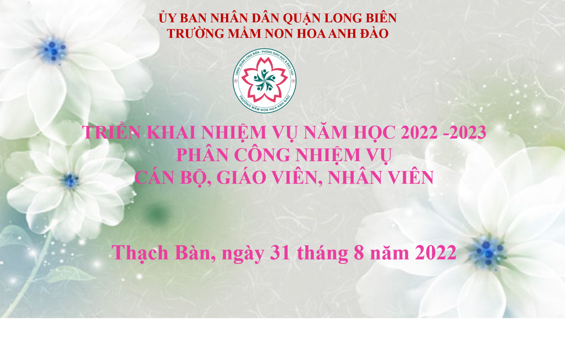 Thực hiện nhiệm vụ năm học 2022-2023, chiều ngày 31/8/2022 trường Mầm non Hoa Anh Đào đã tổ chức hội nghị “Triển khai nhiệm vụ năm học 2022-2023. Phân công nhiệm vụ Cán bộ, giáo viên, nhân viên”.
