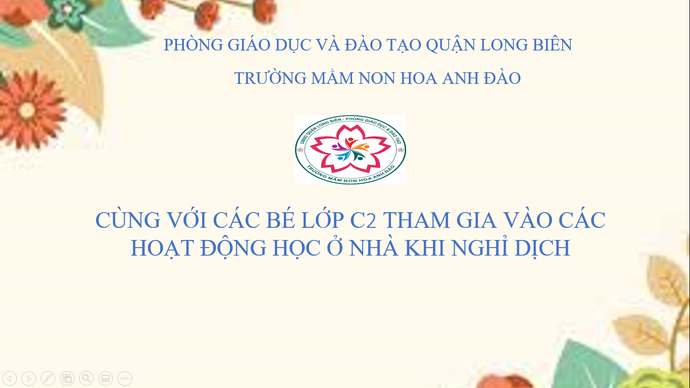 Vậy là năm học mới đã diễn ra được một tháng. Trước diễn biến vô cùng phức tạp của dịch bệnh Covid-19, cô và trò trường Mầm non Hoa Anh Đào nói riêng cũng như tất cả học sinh các cấp trên địa bàn thành phố Hà Nội không thể đến trường học trực tiếp mà thay vào đó là những buổi học trực tuyến. Đây là những khó khăn vất vả của cả cô và trò song không vì đó mà tinh thần dạy và học của cô trò bị giảm đi mà trái lại các con lại rất hứng thú với việc học như vậy. Trong suốt thời gian qua, dưới sự chỉ đạo của các cấp lãnh đạo, của Ban giám hiệu, của tổ chuyên môn đã tạo điều kiện hướng dẫn, tập huấn cho giáo viên trường Mầm non Hoa Anh Đào để thiết kế các bài giảng điện tử, các video bài dạy có chất lượng để gửi về cho phụ huynh và học sinh thông qua nhóm zalo của lớp. Với những bài giảng, video được lồng cả giọng nói và hình ảnh của cô kết hợp với những hình ảnh sinh động của giờ học, các bé lớp mẫu giáo bé C2 rất hào hứng xem và học theo cô. Sau mỗi bài giảng được cô gửi về, các bậc phụ huynh cùng phối hợp dạy con và học cùng con, quay những clip của các con và gửi về cho giáo viên. Đó chính là niềm vui và là động lực to lớn để các cô cố gắng tạo ra những bài giảng hay, tâm huyết để gửi cho các con và các cô cũng mong rằng mỗi bài giảng sẽ giúp các con có được những hiểu biết ban đầu về môi trường xung quanh và giúp các con có thêm những kỹ năng để sẵn sàng quay lại trường học khi dịch bệnh được đẩy lùi. Dưới đây là một số clip và hình ảnh của các con học tập ở nhà: