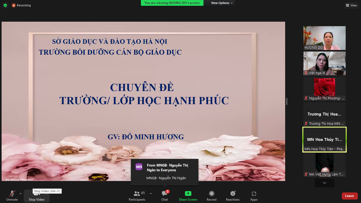 Ngày 27/11 được sự quan tâm của các cấp lãnh đạo và Phòng GDĐT Quận Long Biên, đã tạo điều kiện cho các CBQL và giáo viên mầm non trong quận tham gia lớp tập huấn chuyên đề 17: “ Tập huấn chuyên đề trường /lớp mầm non hạnh phúc” do thạc sĩ Đỗ Minh Hương giảng dạy trực tuyến qua phòng zoom và được chia nhỏ đến các điểm cầu để tất cả các giáo viên trong nhà trường được tham gia đầy đủ.