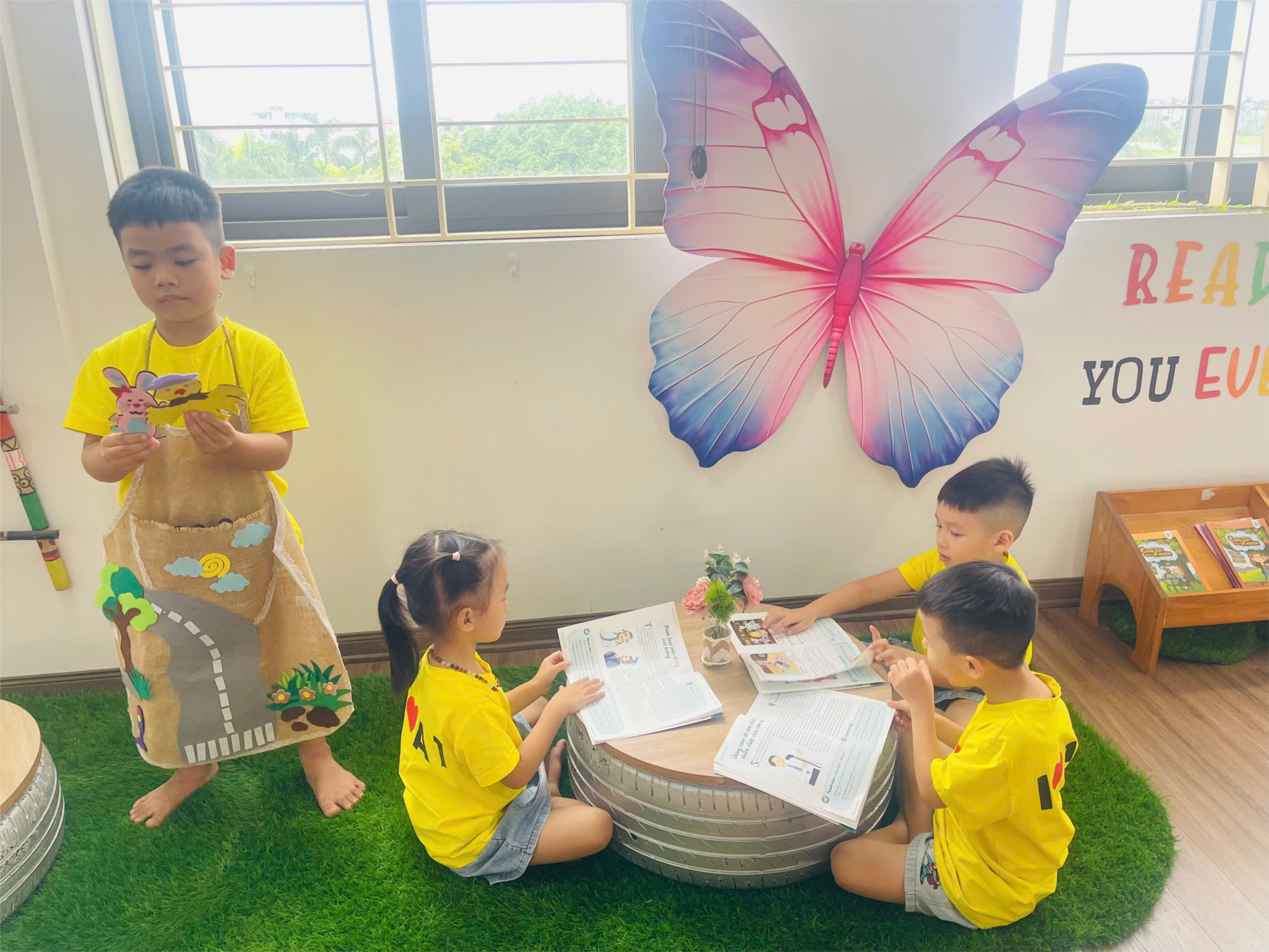Tại đây, các bé được cô giáo giới thiệu những cuốn sách tranh đầy màu sắc, nghe kể chuyện theo sách, tham gia hoạt động “đọc sách cùng cô”, và cùng nhau chia sẻ những điều thú vị từ câu chuyện yêu thích. Một số bé còn được làm quen với sách điện tử trên màn hình tương tác, góp phần phát triển kỹ năng công nghệ bước đầu.