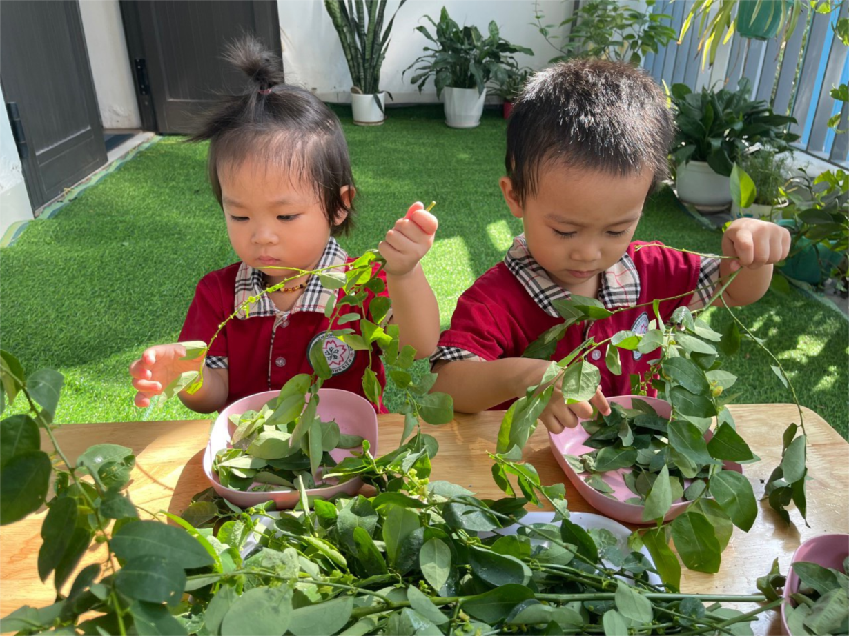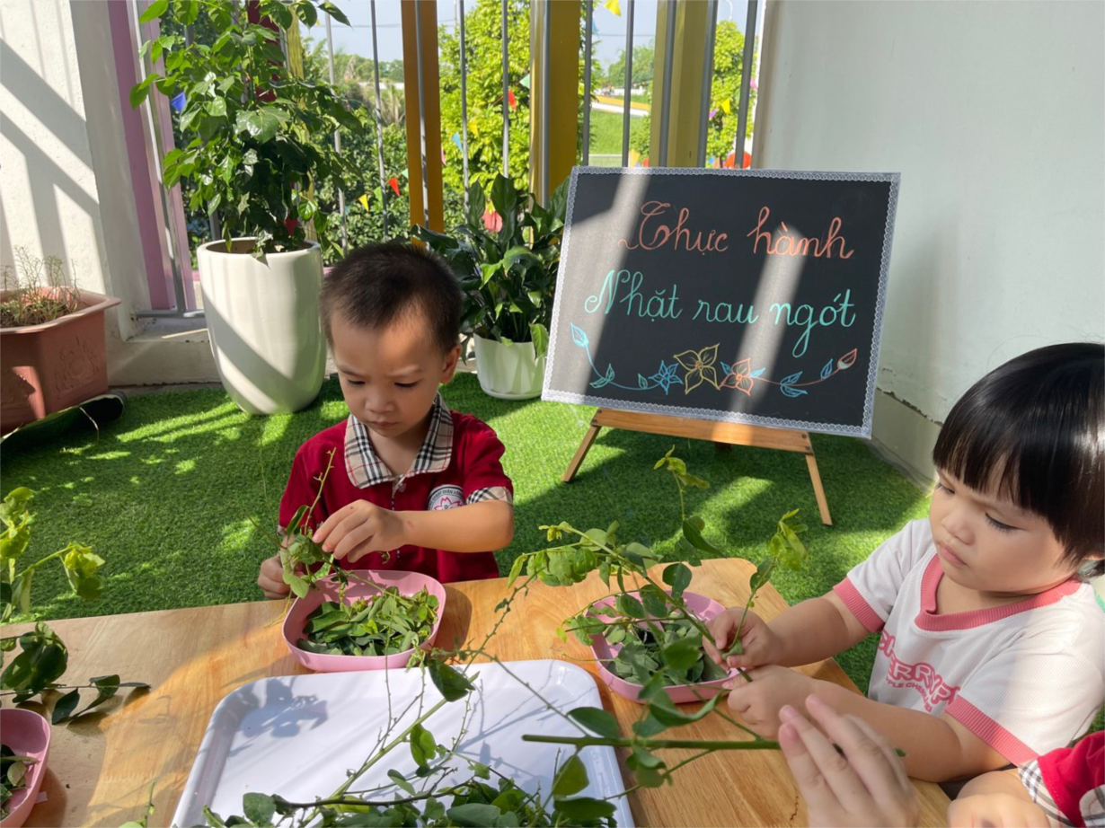 Các bé lớp NT D1 tham gia HĐTN "Nhặt rau ngót"