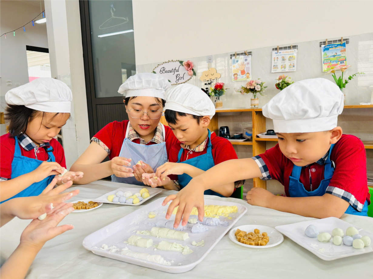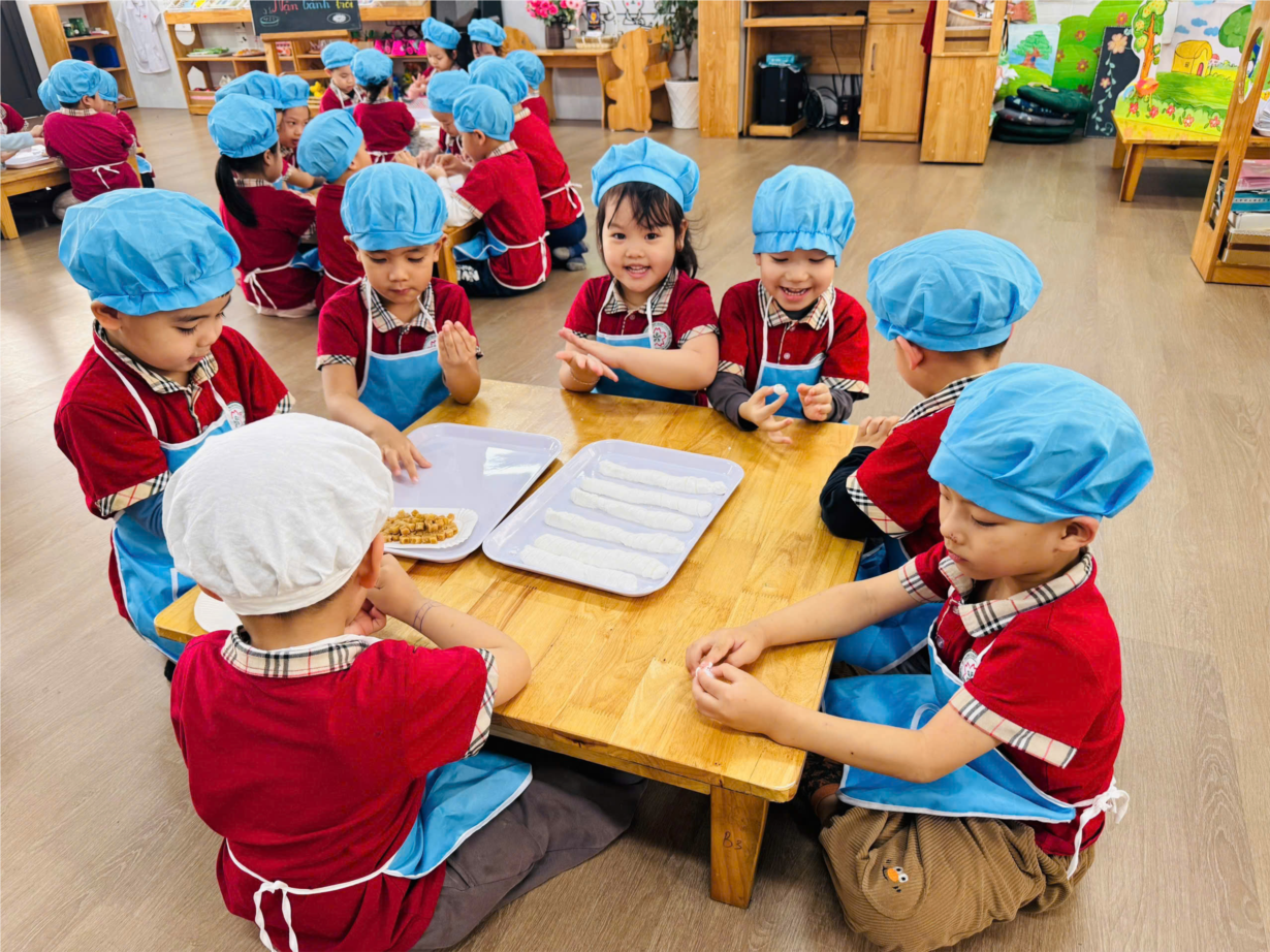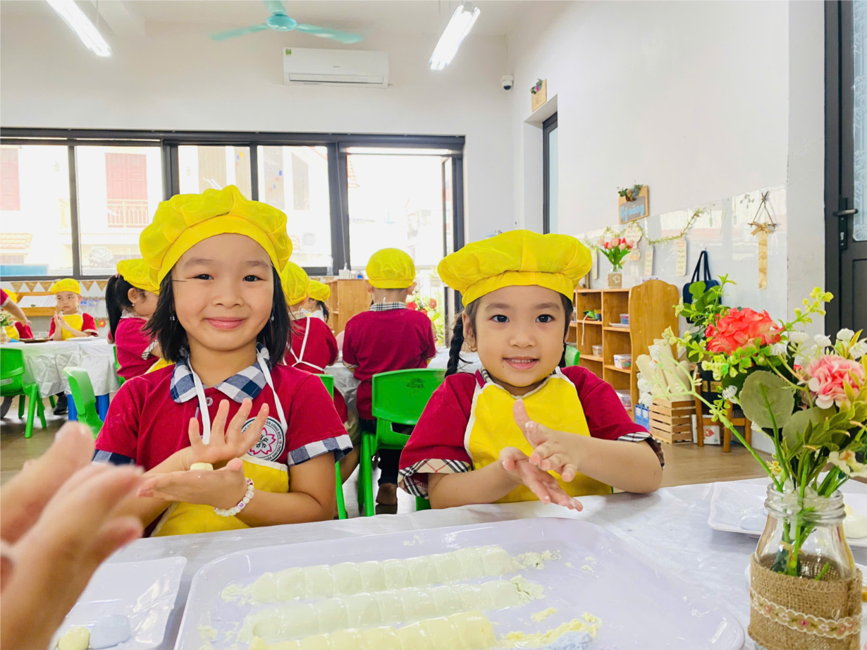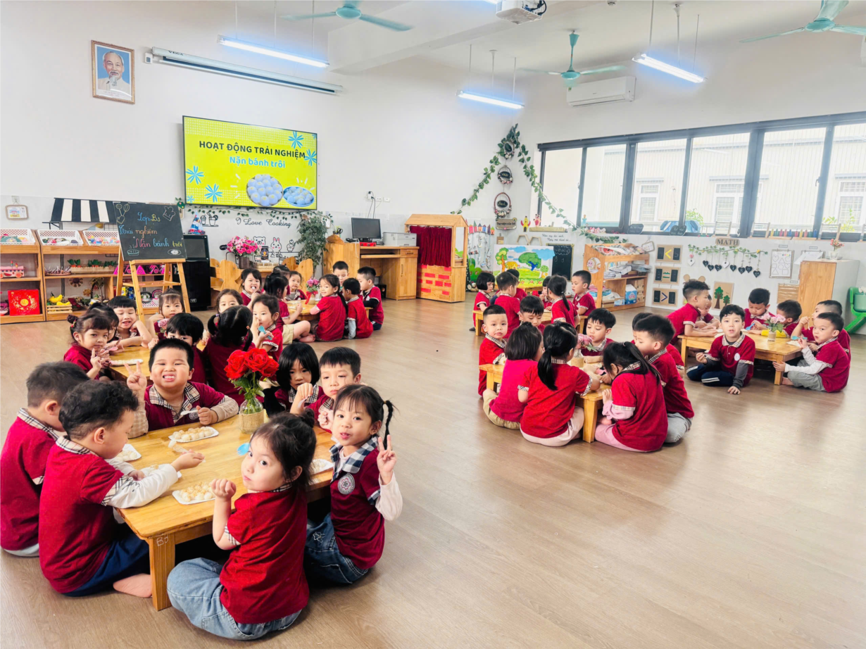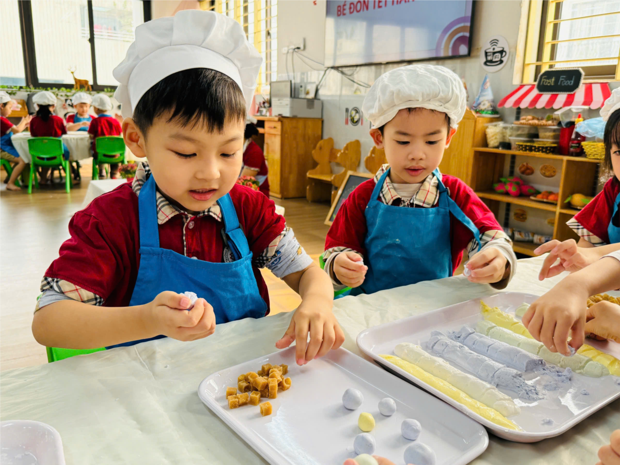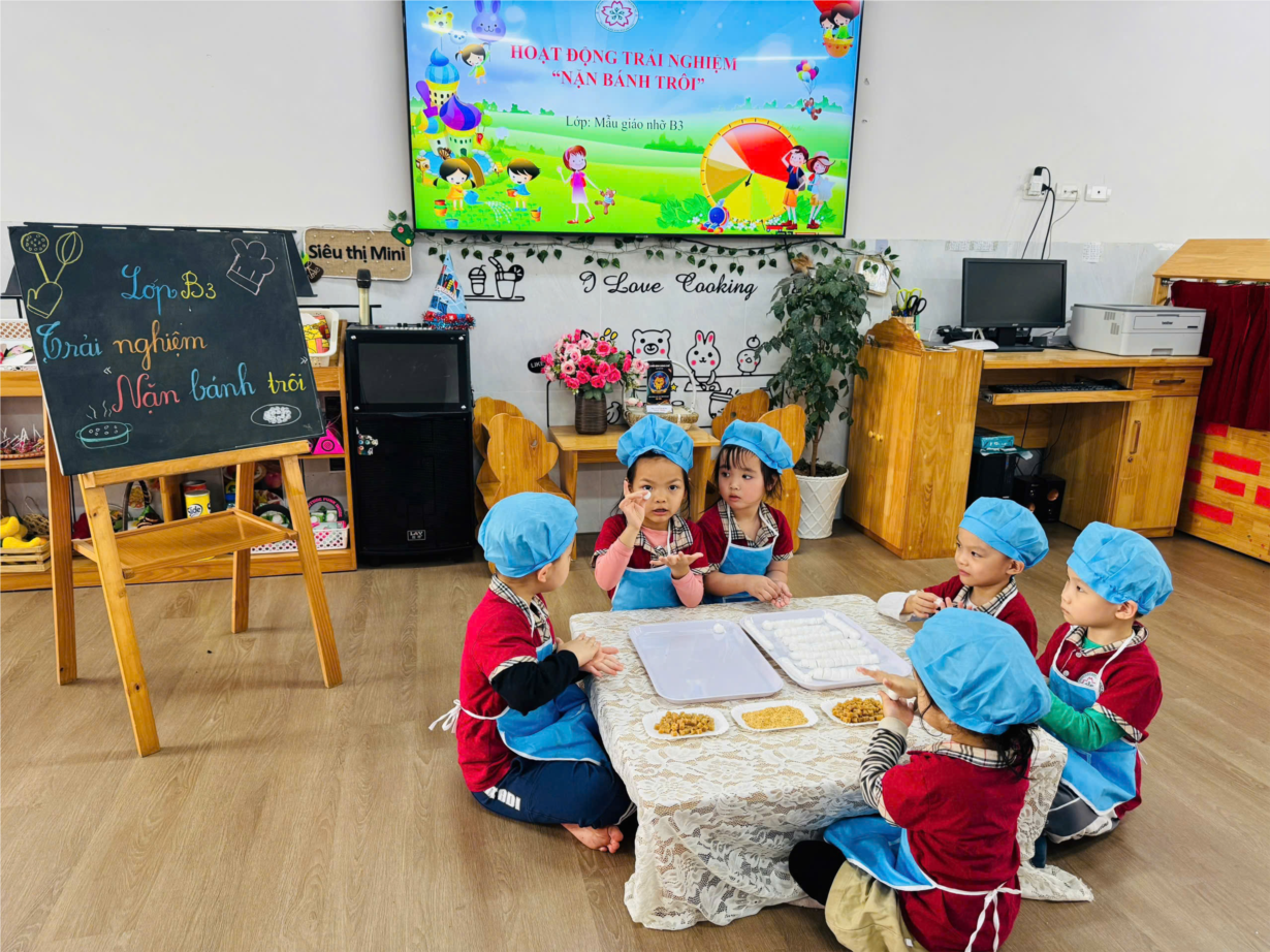 Các bé yêu lớp B3 tham gia hoạt động trải nghiệm "Nặn bánh trôi" nhân ngày Tết Hàn Thực.