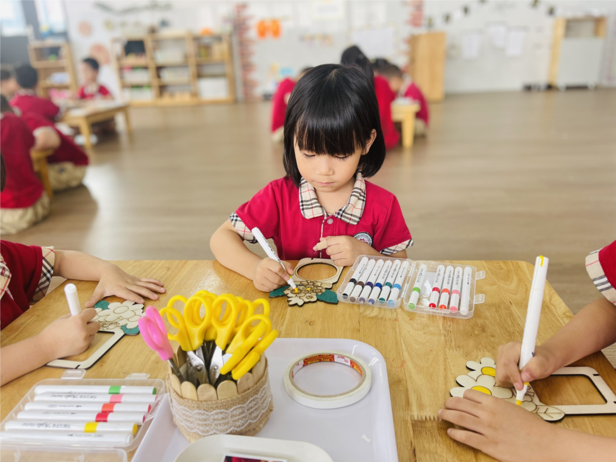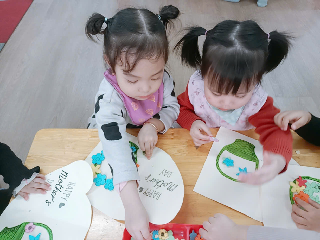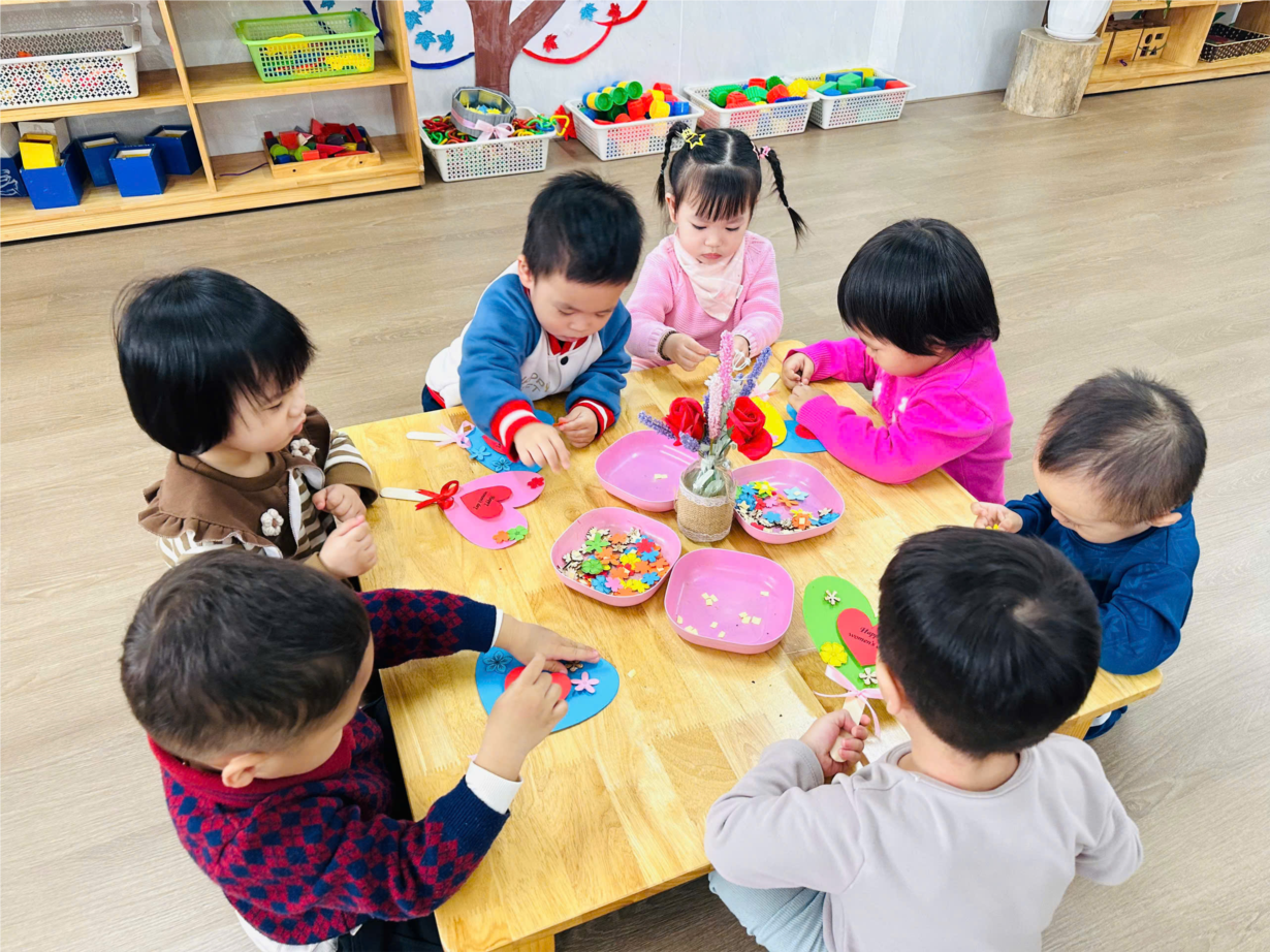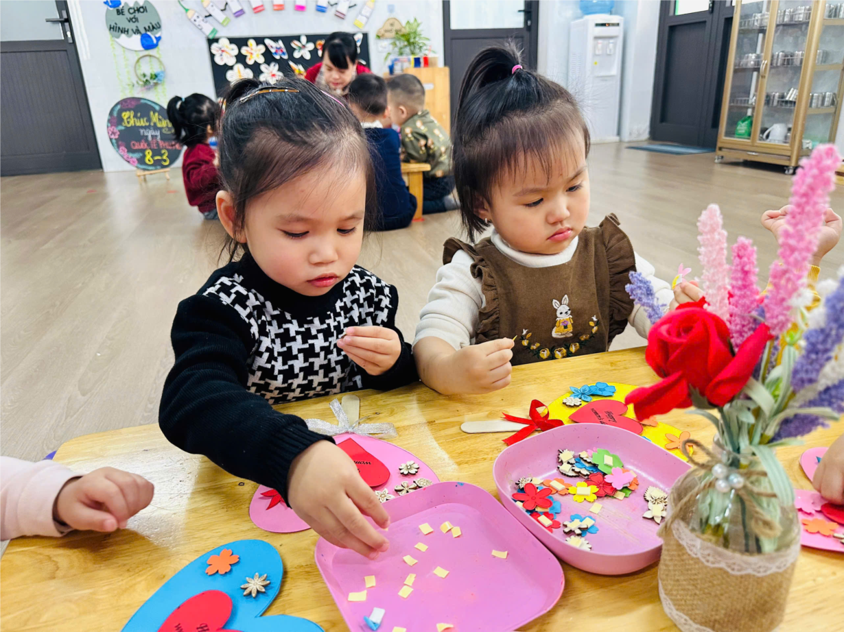 Các bạn nhỏ lớp NT D2 trang trí thiệp 8-3 tặng bà, tặng mẹ