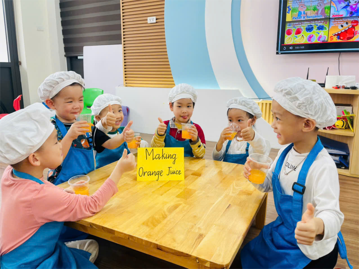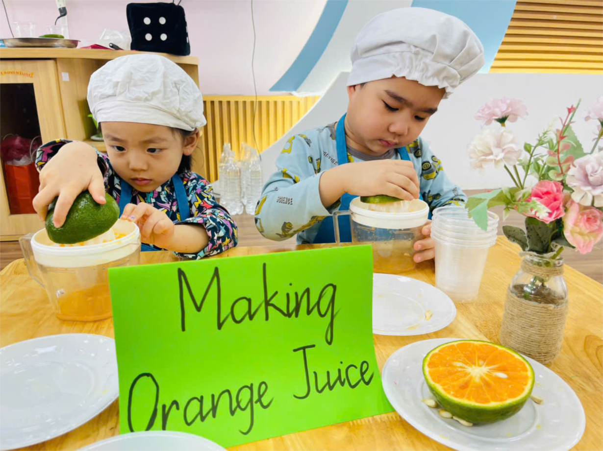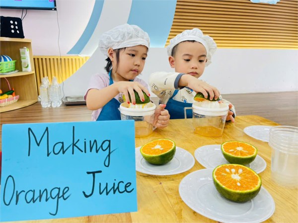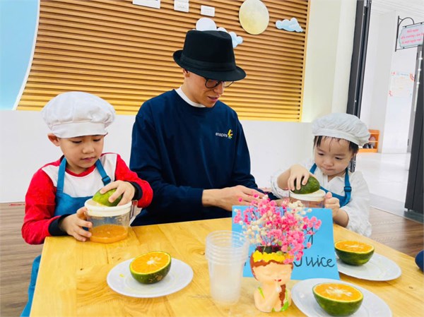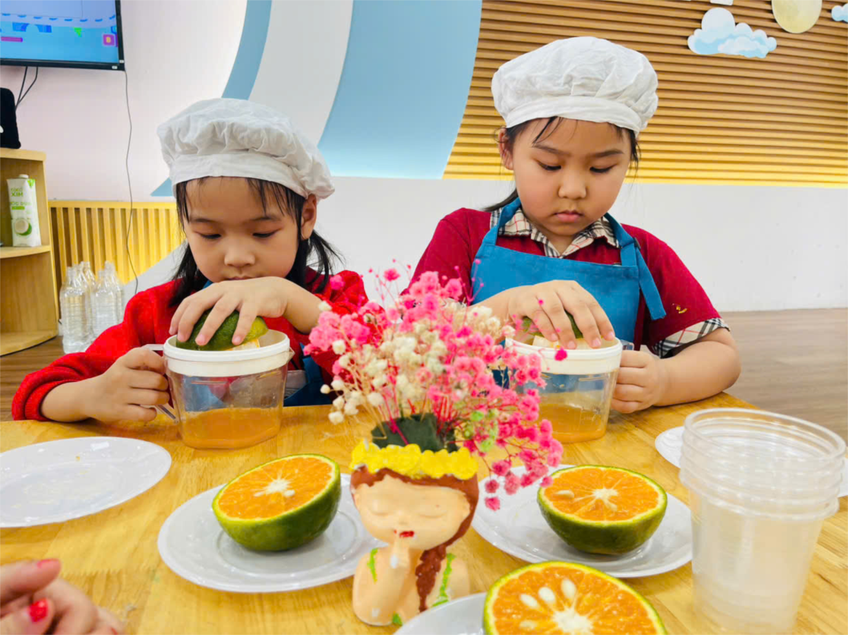 Hoạt động trải nghiệm vắt nước cam của các bé lớp B1