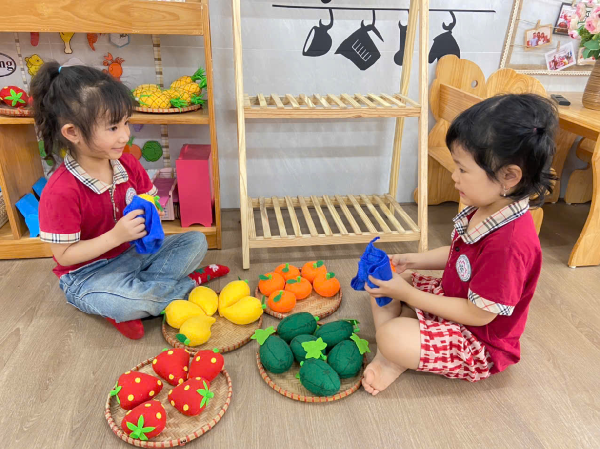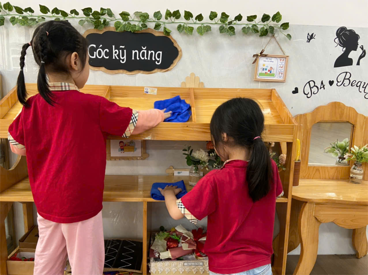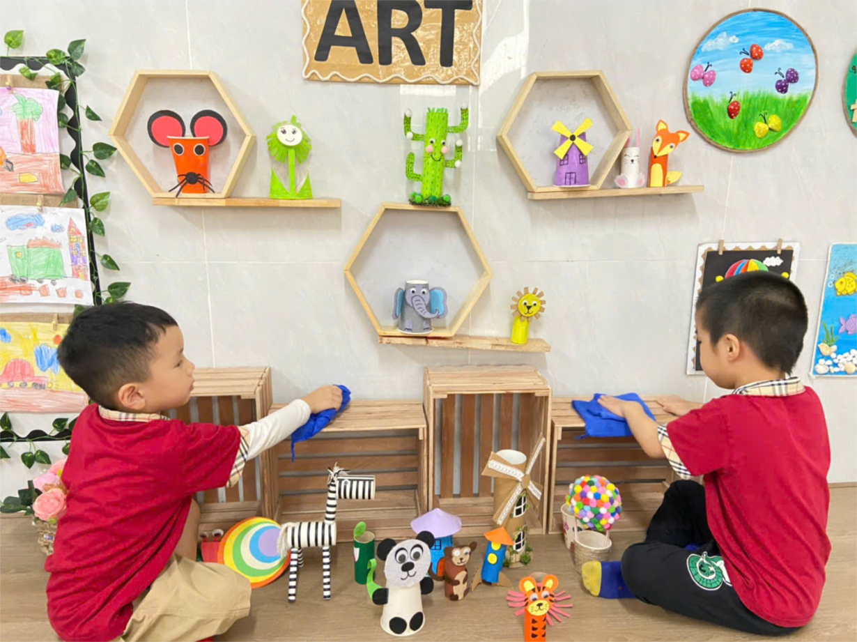 Các bạn lớp B4 tham gia hoạt động lau dọn đồ dùng đồ chơi trong lớp học