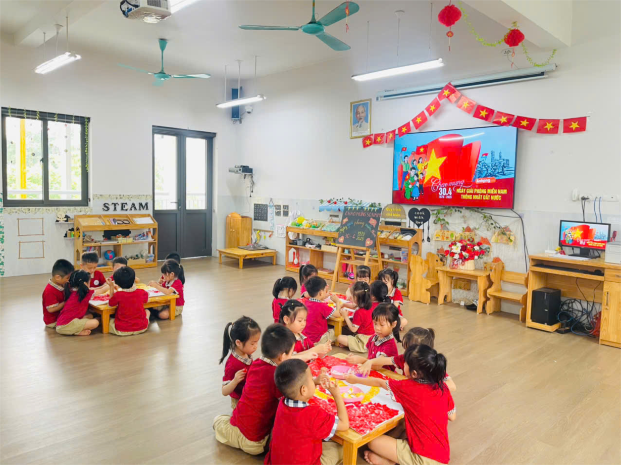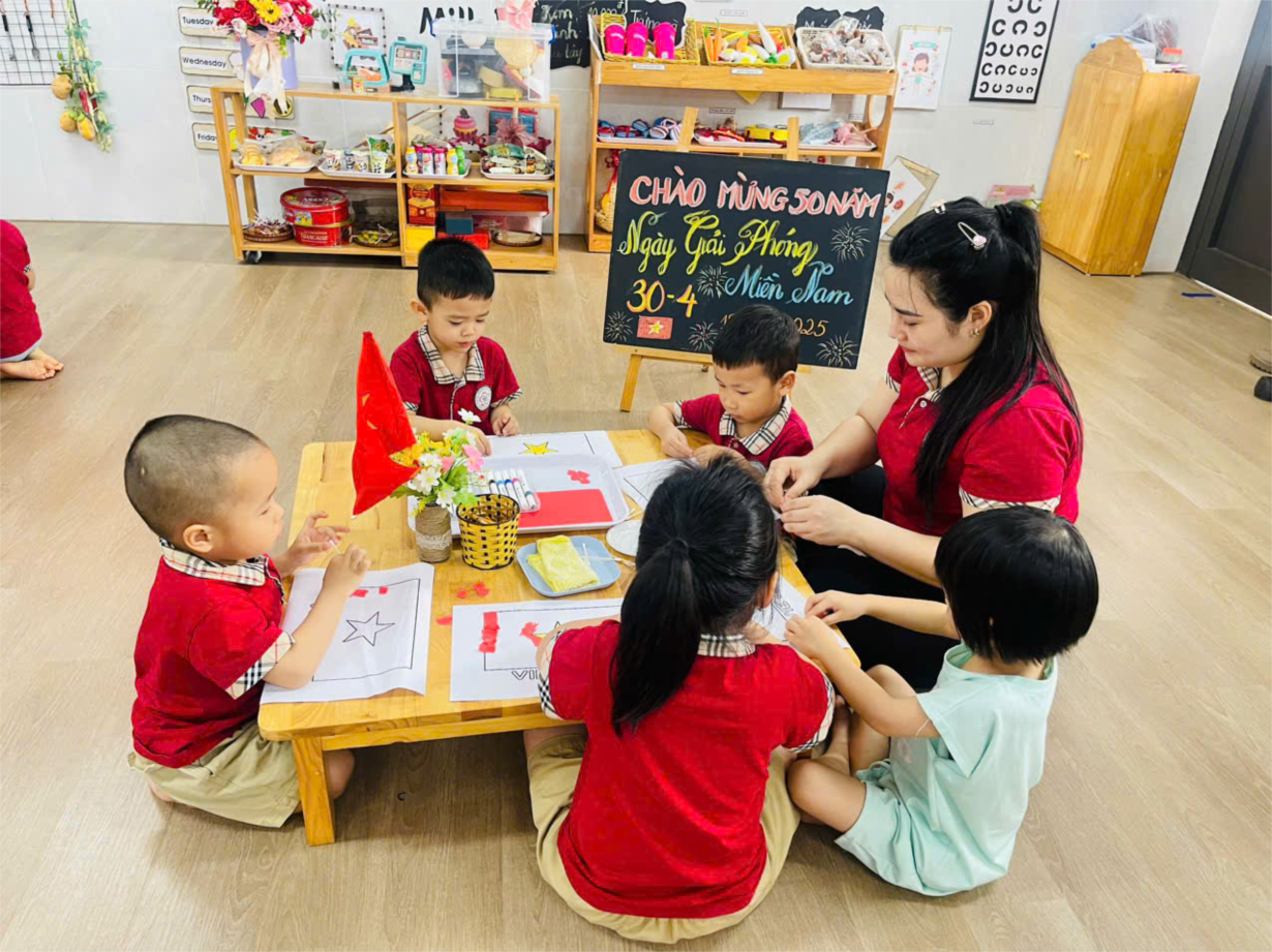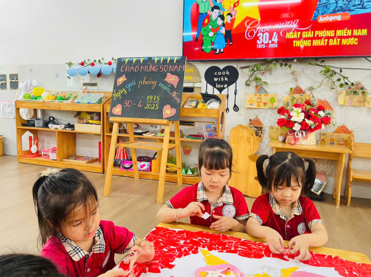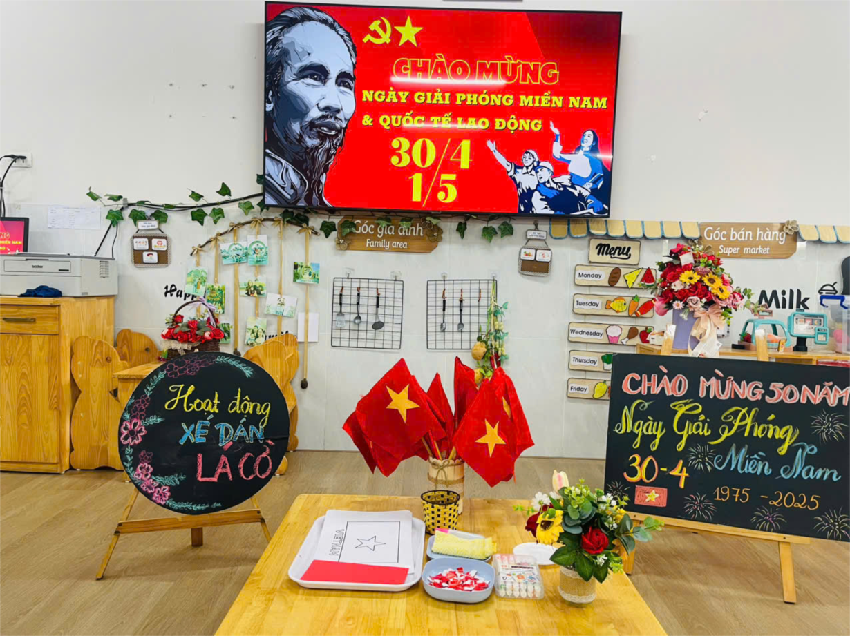 LỚP B1 CHUNG TAY DÁN LÁ CỜ, CỜ ĐẢNG, BẢN ĐỒ VIỆT NAM CHÀO MỪNG NGÀY 30/4