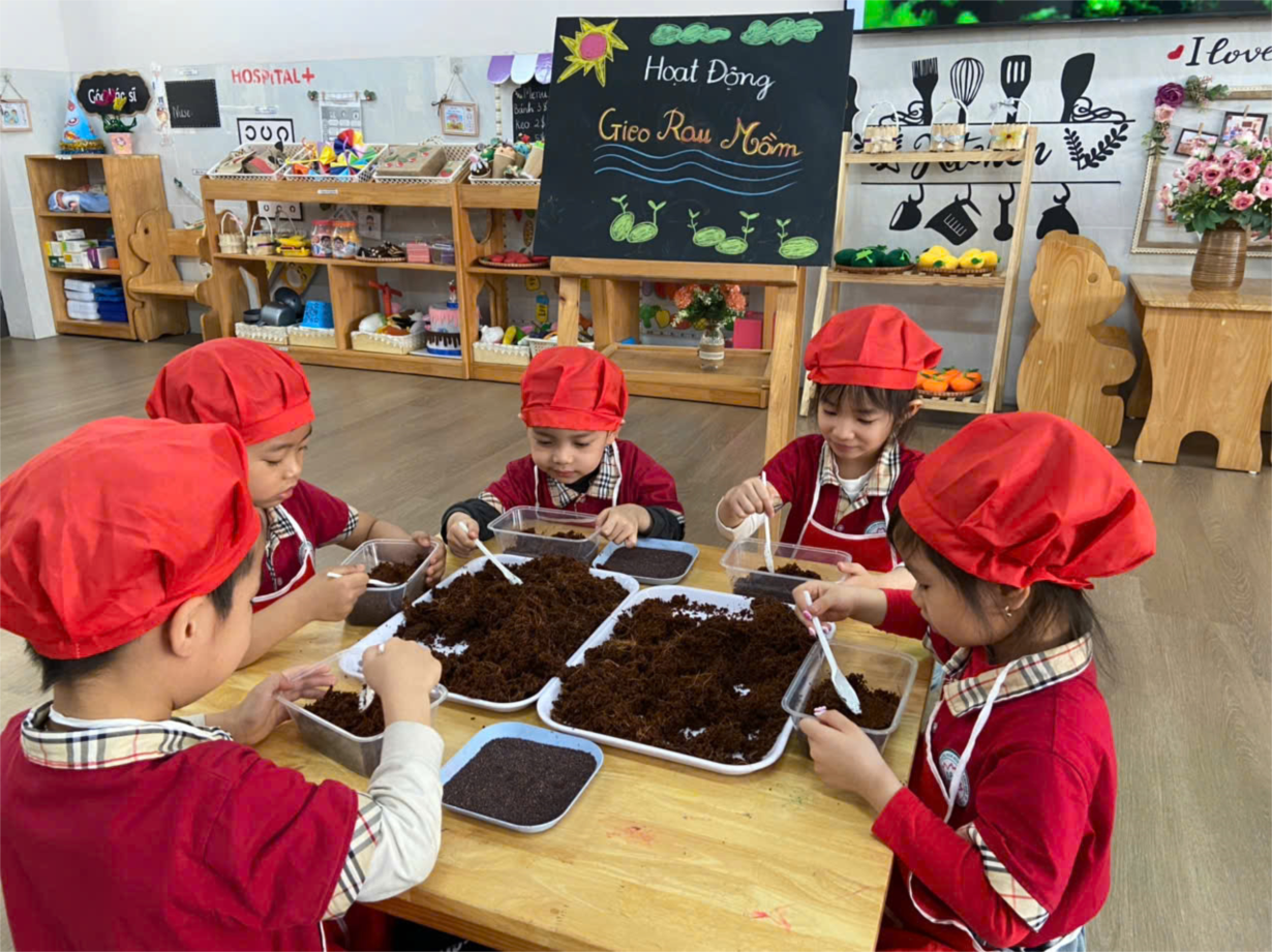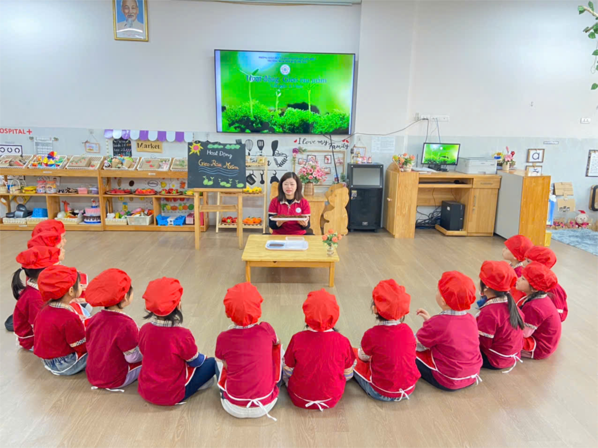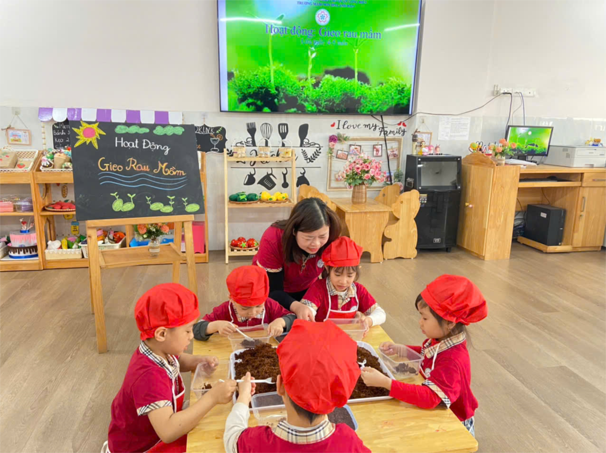 Các bạn nhỏ lớp B4 reo hạt rau mầm