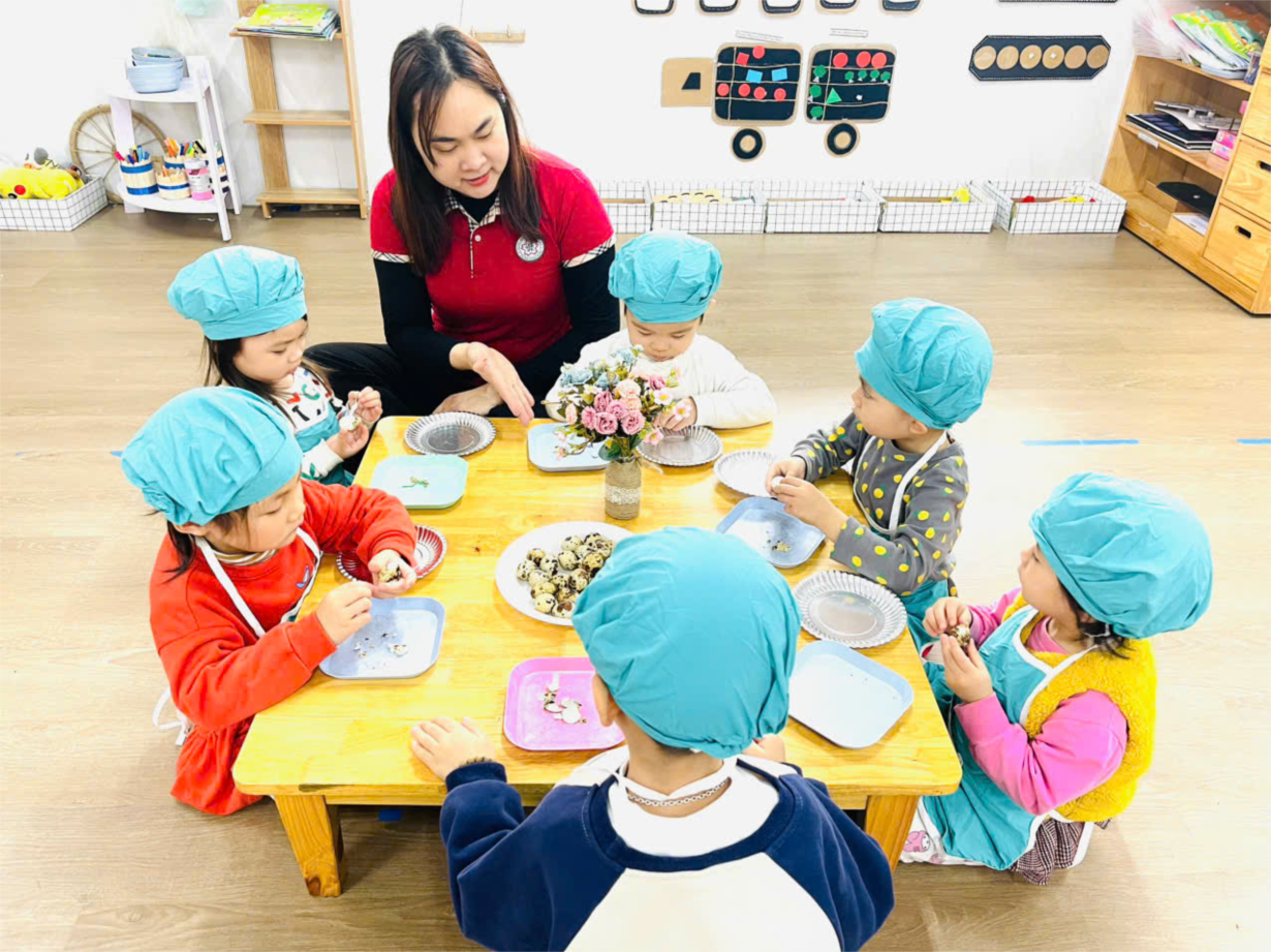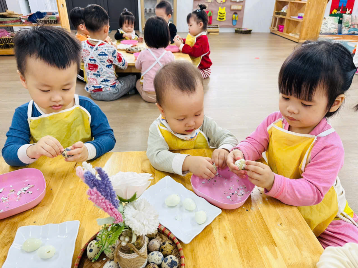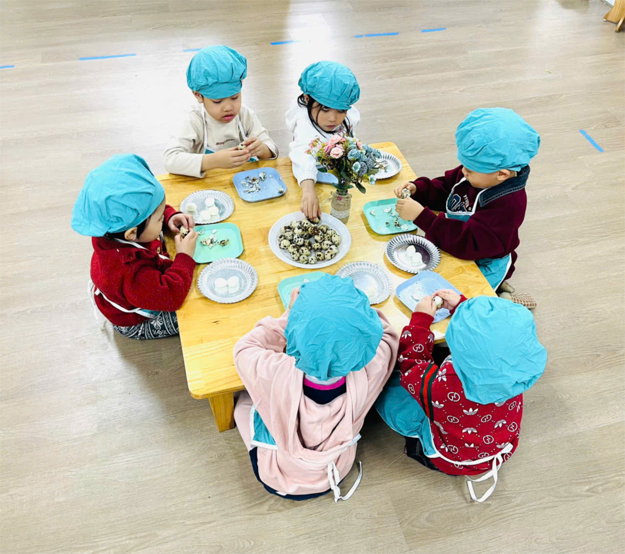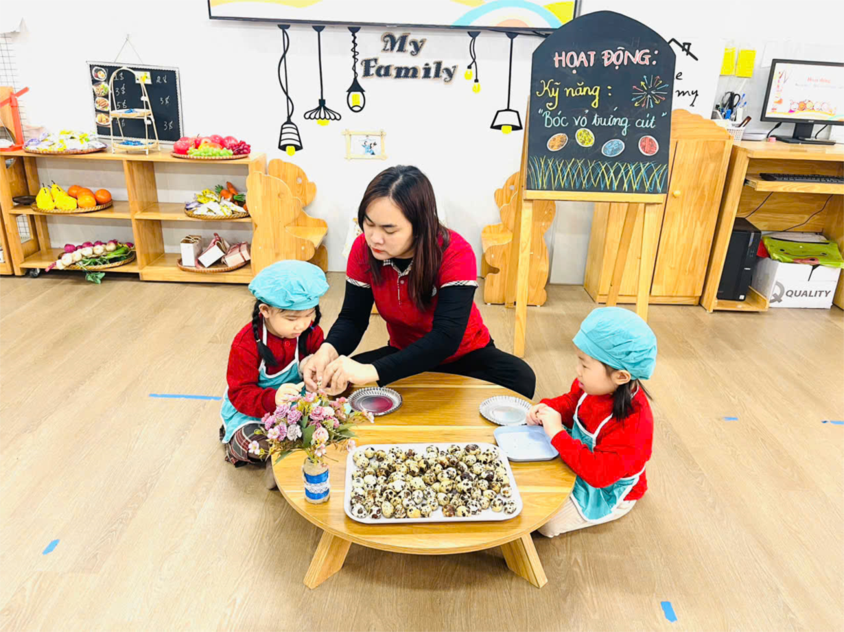 Hoạt động trải nghiệm " Bóc trứng chim cút" của các bé lớp C4.