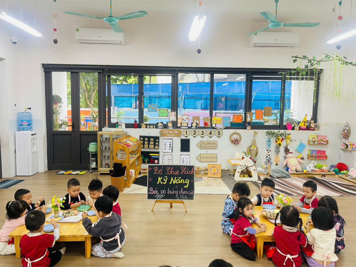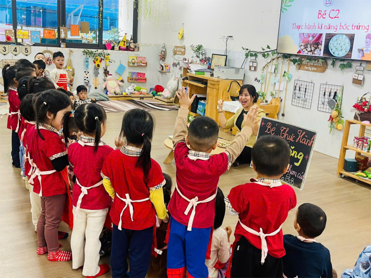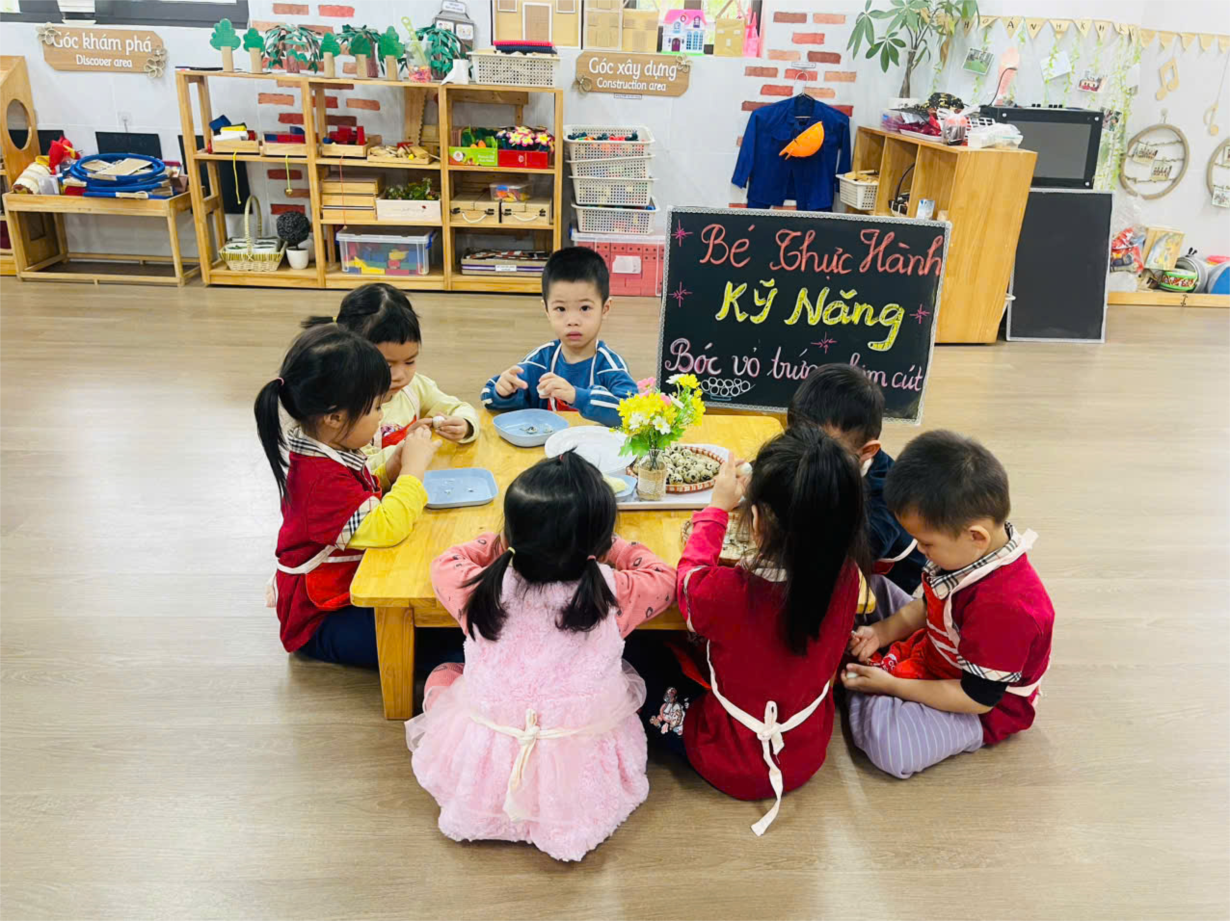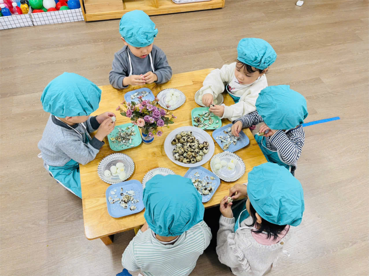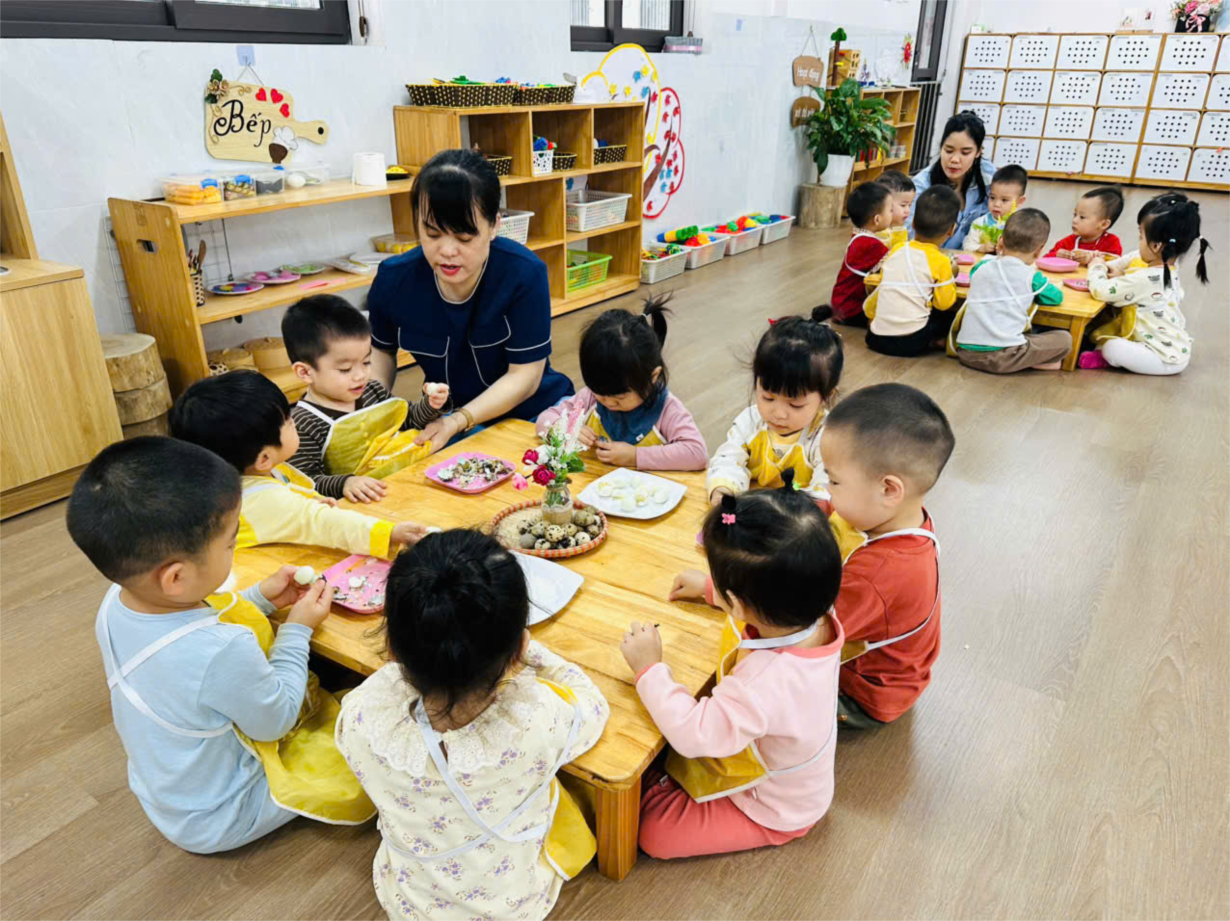 Hoạt động trải nghiệm " Bóc trứng chim cút" của các bé lớp C4.