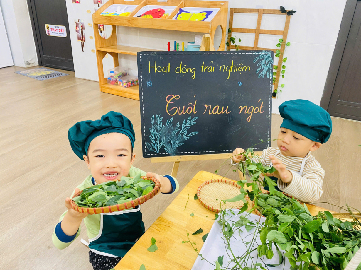 Các bé lớp NT D1 thích thú tham gia HĐTN "Nhặt rau ngót"