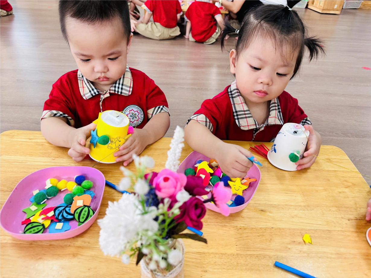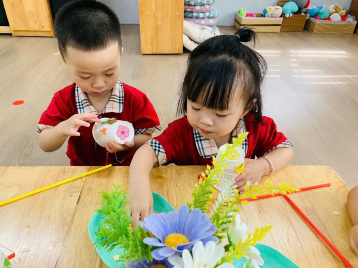 Các bé lớp NT D1 trang trí đèn lồng để vui trung thu