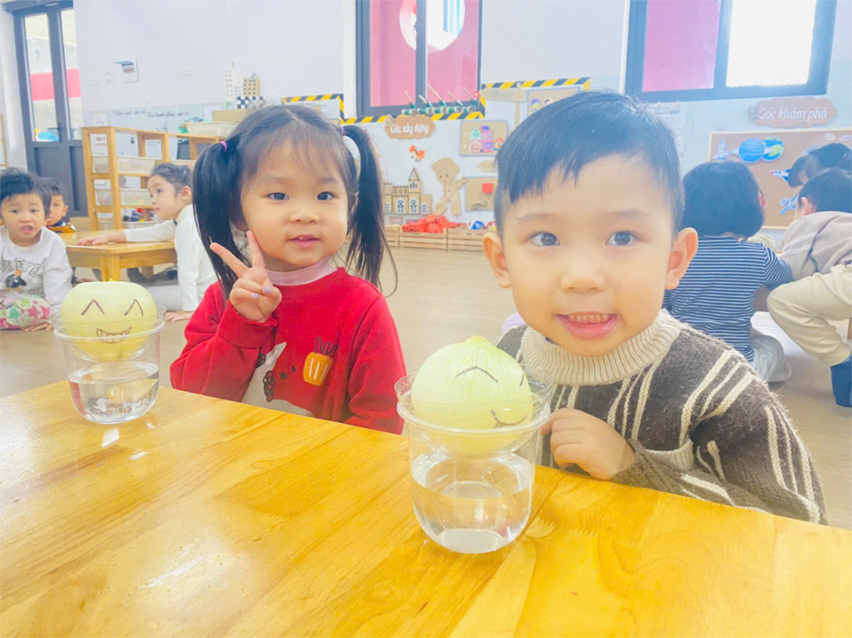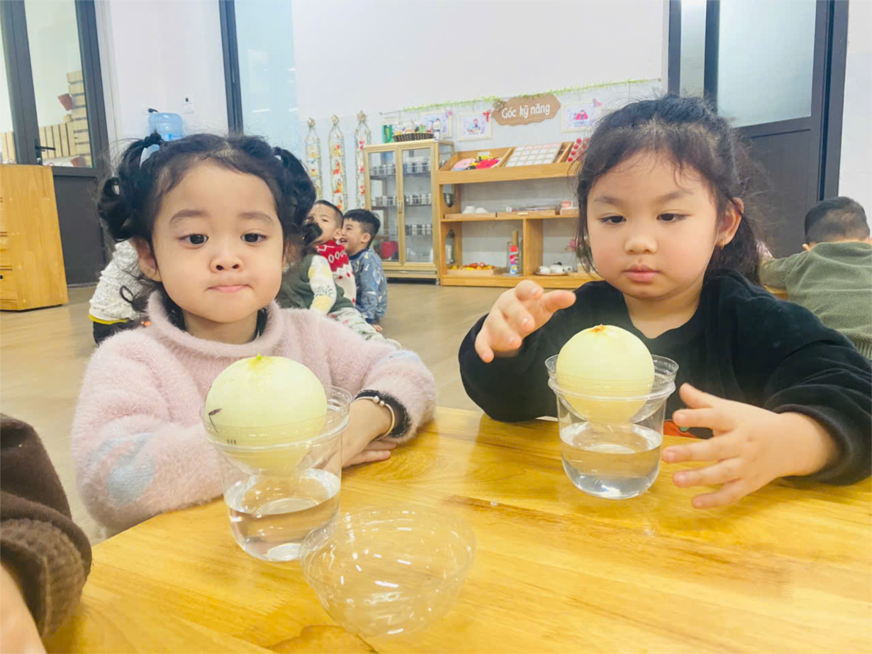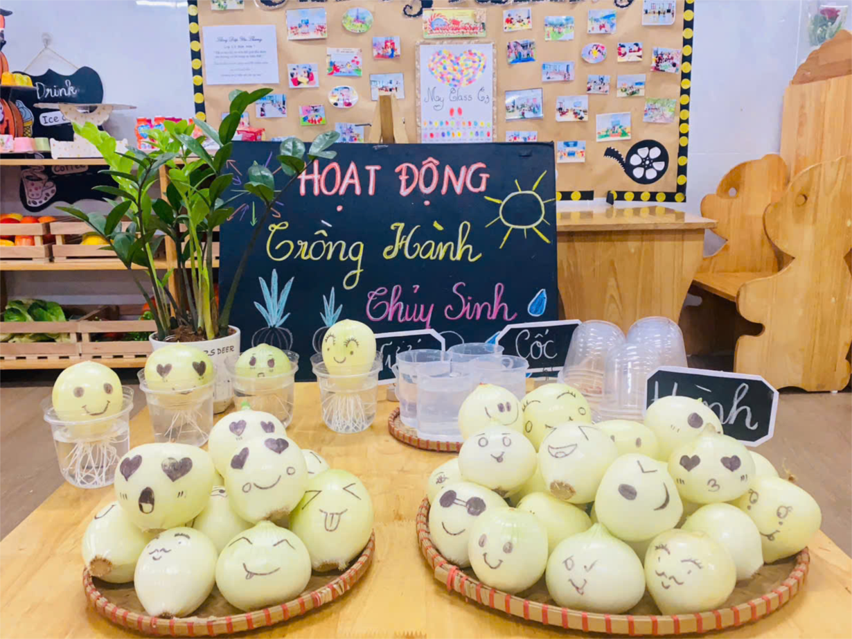 Hoạt động ' Trồng hành tây thủy sinh" của cô trò lớp bé C3.